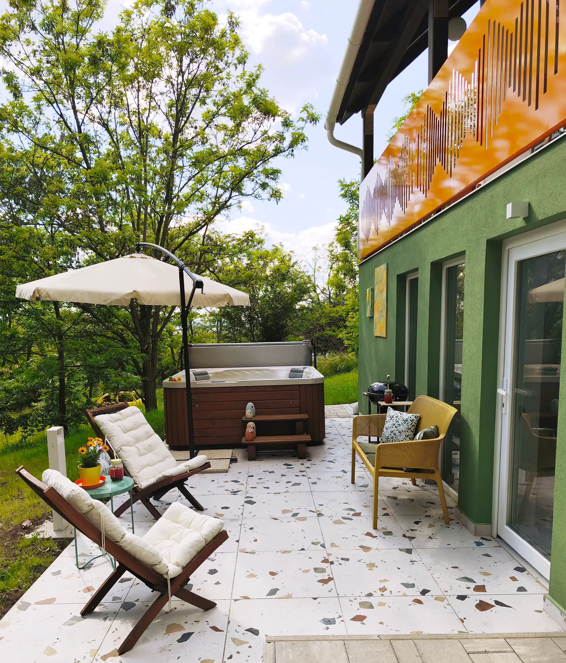 A házhoz tartozó privát jacuzzi közvetlenül a bejárat melletti erdei panorámával a teraszon kapott helyet. Lazítsatok a természet közvetlen közelében. Élvezzétek a pezsgőfürdő nyújtotta relaxációt kiváló lehetőség testünk és lelkünk feltöltésére.
